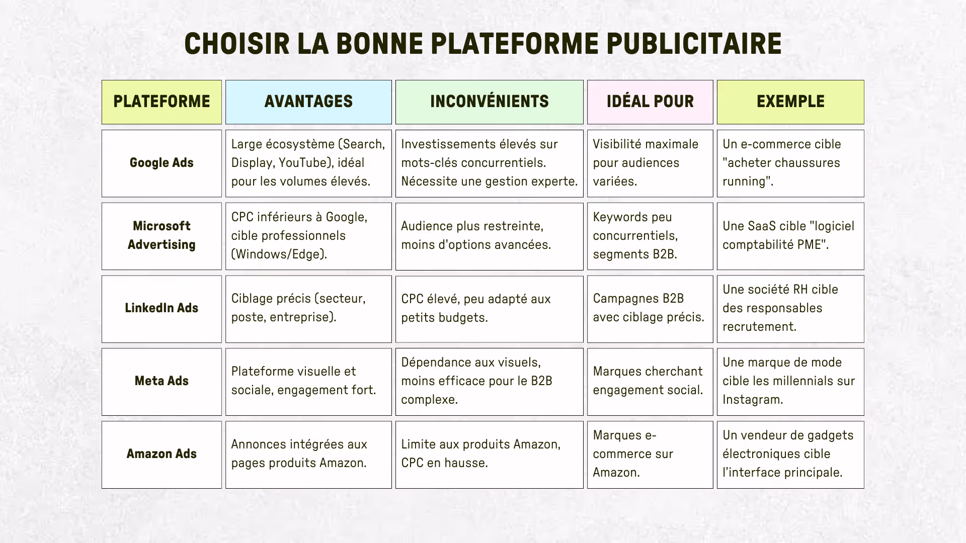Le choix de la plateforme dépend de vos objectifs, de votre audience et de votre budget. Chaque plateforme offre des avantages distincts.