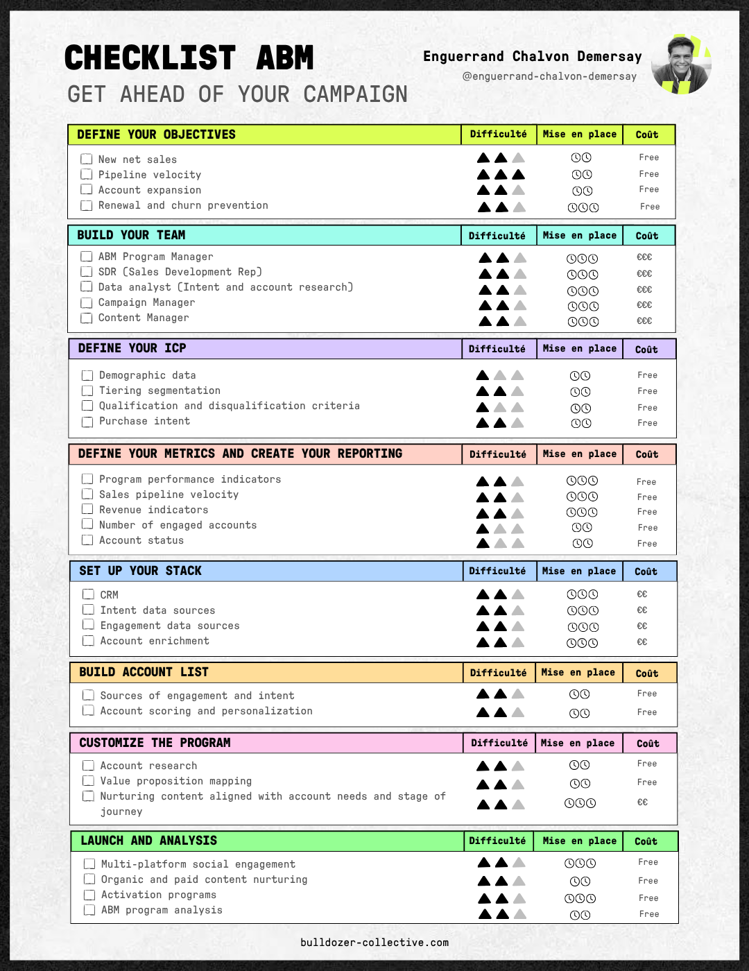 Methodology structured in 8 steps to implement an effective Account-Based Marketing strategy, from the definition of objectives to the analysis of results, with accurate assessment of difficulty and investment levels.