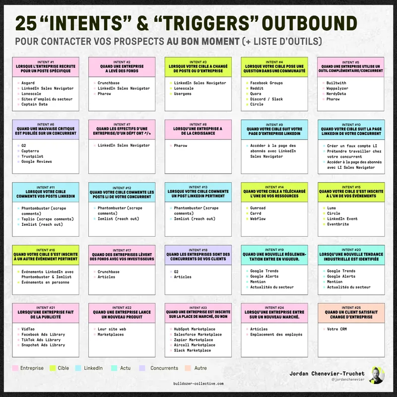 Cartographie complète des 25 signaux d'achat et moments clés pour contacter vos prospects avec précision. Pour chaque scénario, découvrez les outils adaptés pour identifier ces opportunités et maximiser vos taux de conversion. Une ressource stratégique pour vos équipes commerciales et marketing.