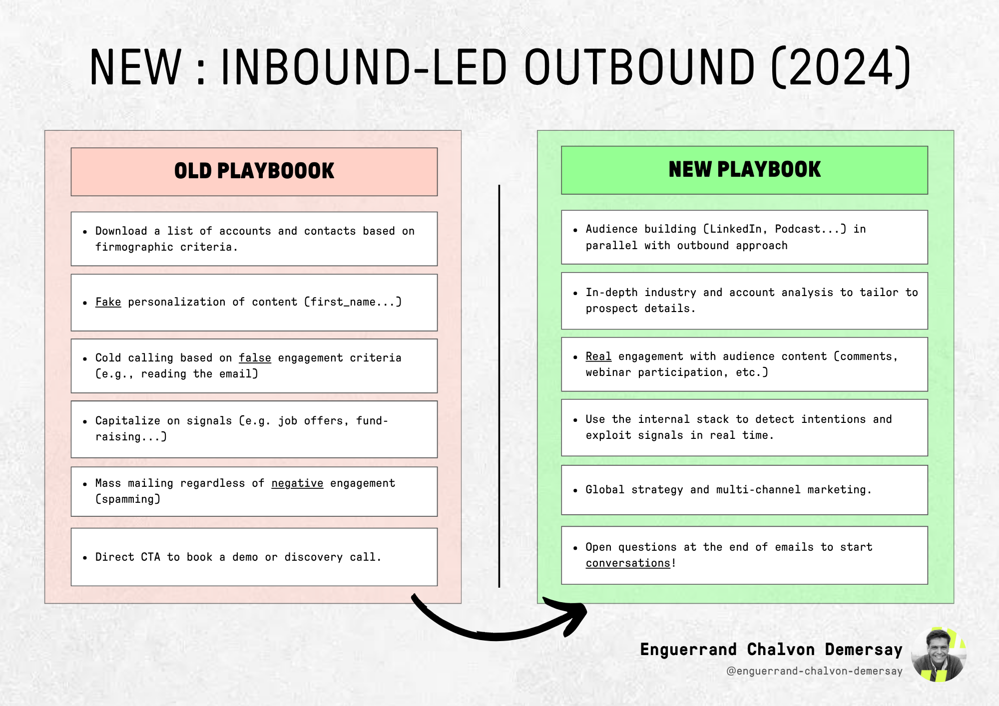 Strategic guide to adapt your outbound approach to new restrictions, moving from a “Push” model to a “Pull” model. Presents an acquisition methodology based on prior engagement of the audience.