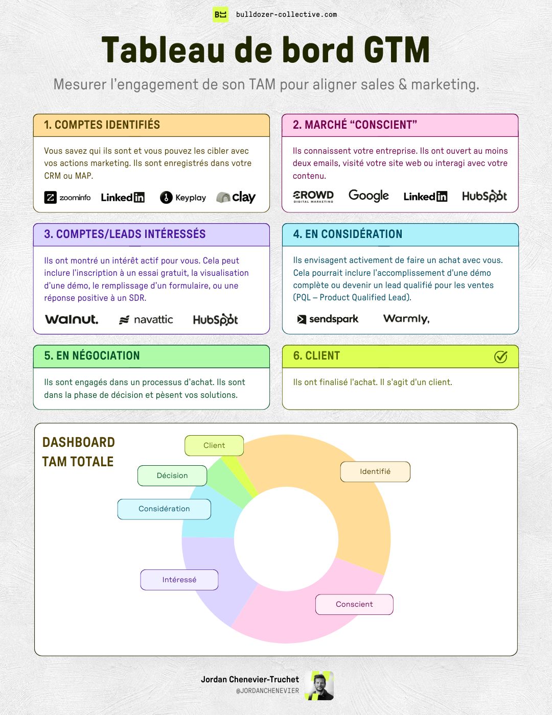 Framework visuel pour mesurer l'engagement de votre marché cible à chaque étape du parcours client. Décompose le TAM en six segments progressifs, du "compte identifié" au "client", avec des outils spécifiques pour suivre et optimiser chaque phase.